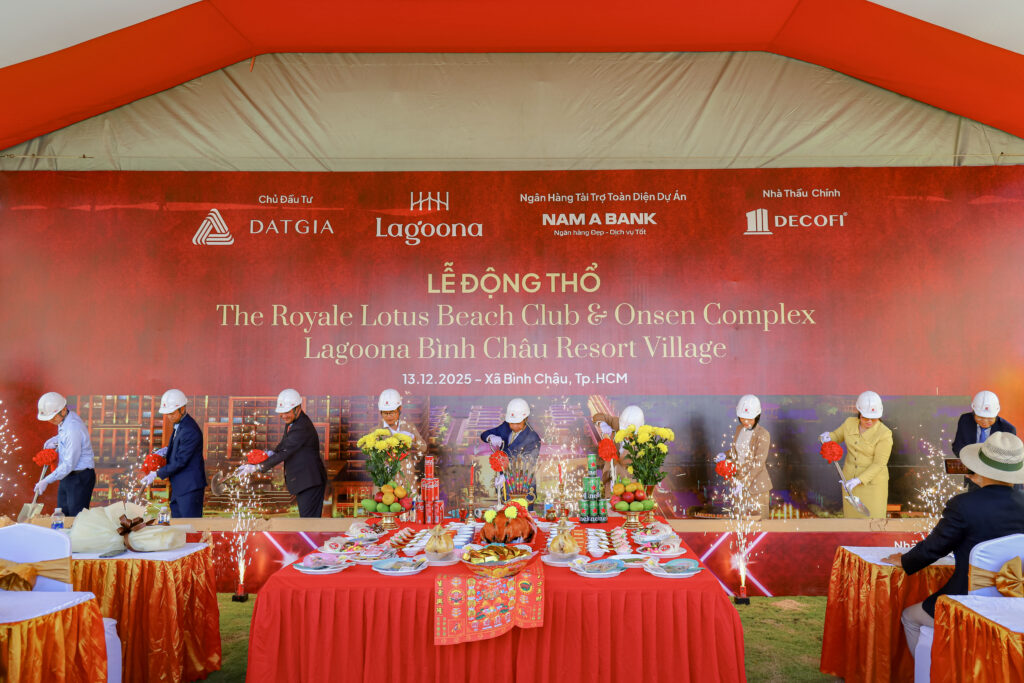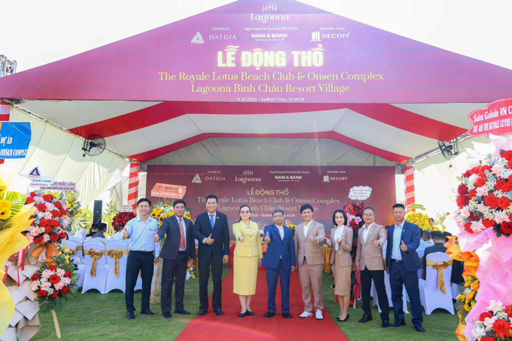 Ngày 13.12.2025, tại dự án Lagoona Bình Châu Resort Village, xã Bình Châu – TP.HCM, Chủ Đầu tư Đạt Gia đã tổ chức Lễ động thổ The Royale Lotus Beach Club & Onsen Complex, với sự góp mặt của Đại diện Lãnh đạo Ngân hàng TMCP Nam Á, Nhà thầu chính – Công Ty Cổ Phần Xây Dựng và Thiết Kế Số 1 (DECOFI), các nhà thầu phụ, các đơn vị tư vấn – giám sát – thiết kế – cung ứng vật tư và các vị khách quý.